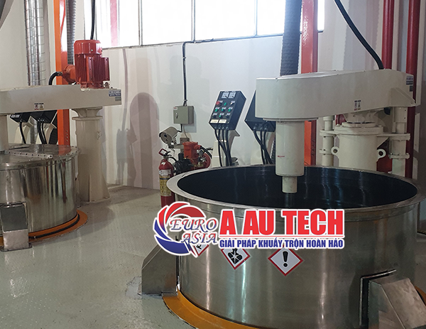 - Máy khuấy chống cháy nổ được công ty Á Âu thiết kế với hệ thống nâng hạ trục khuấy tự động, có cơ cấu kẹp thùng, và tủ điều khiển tốc độ khuấy.